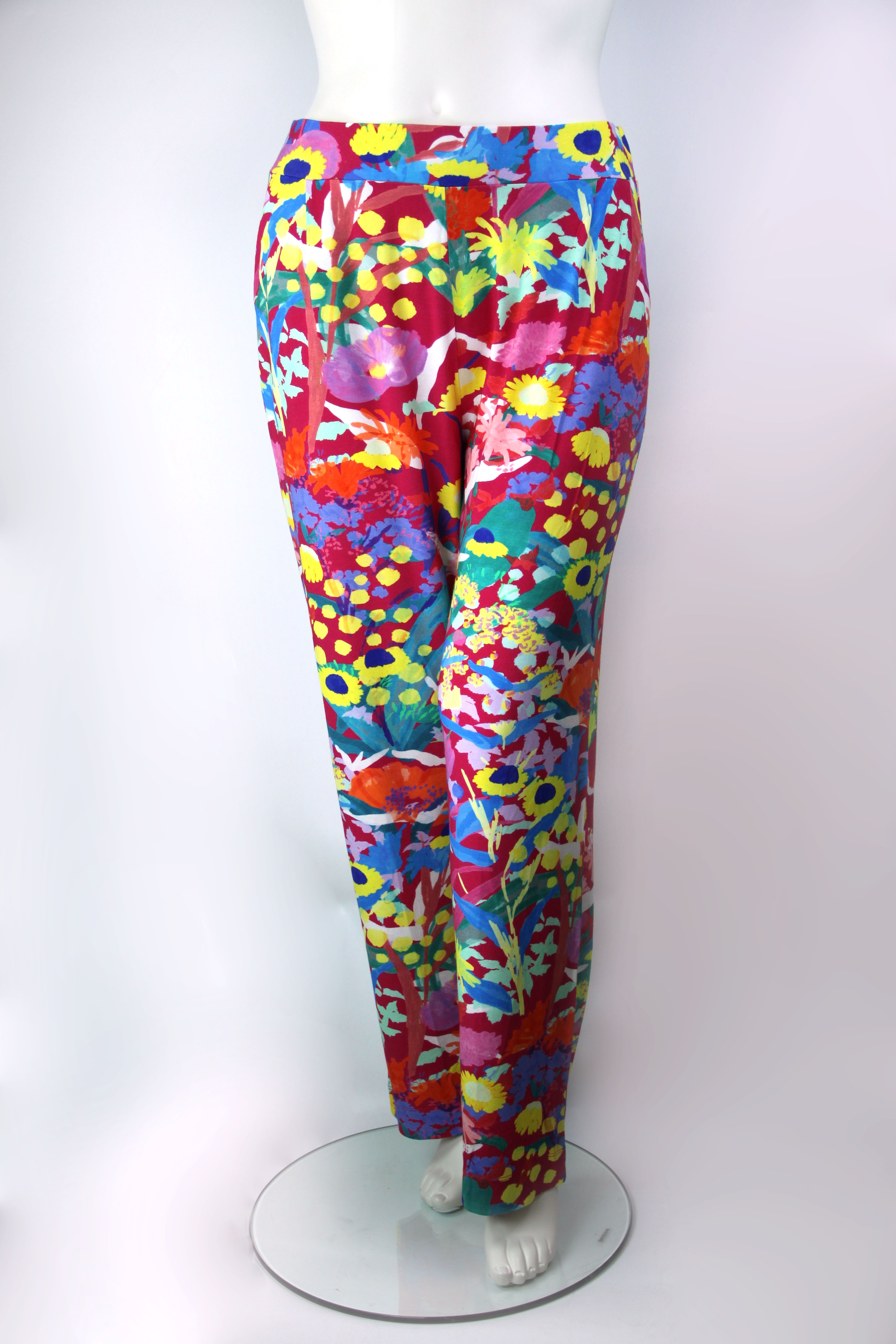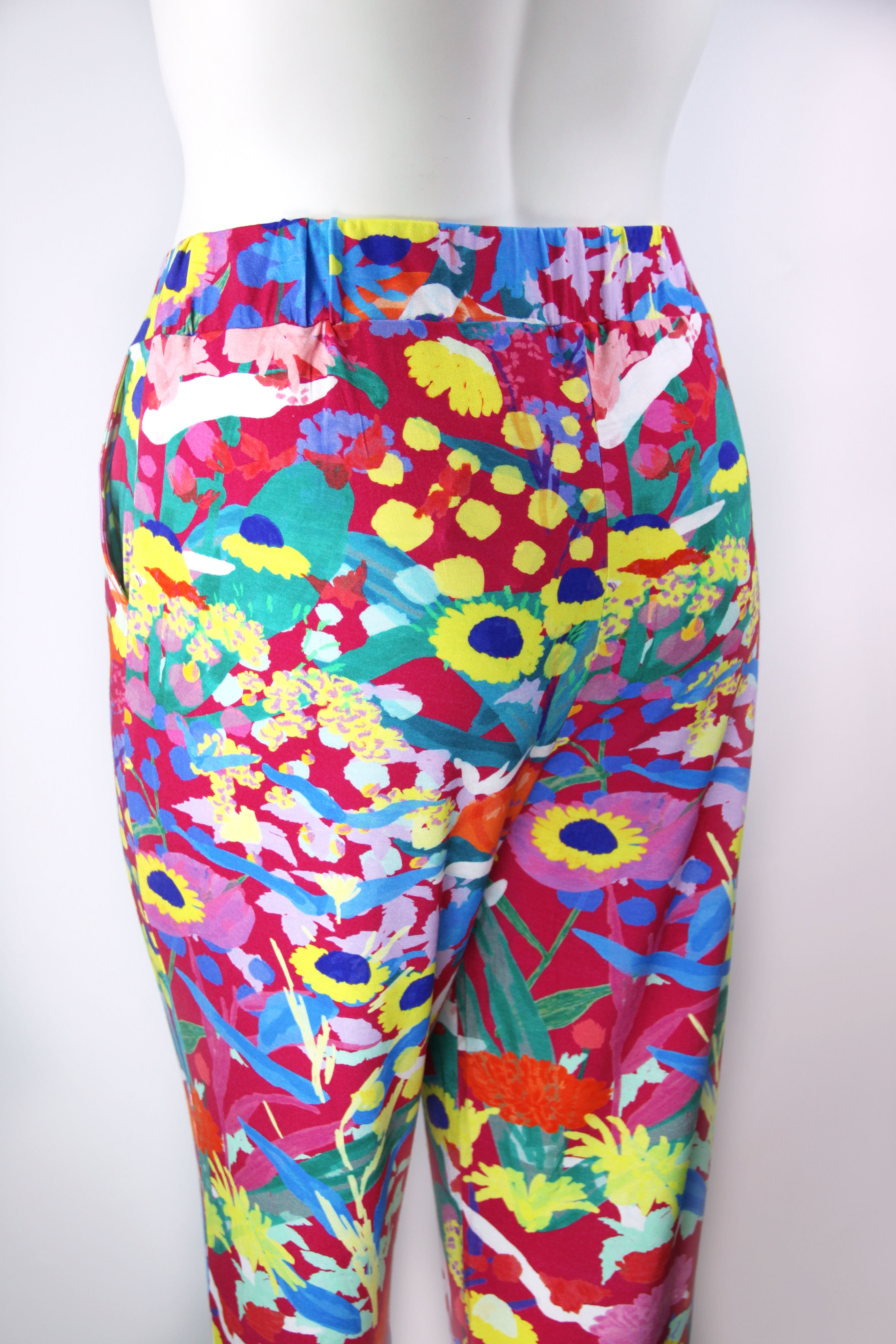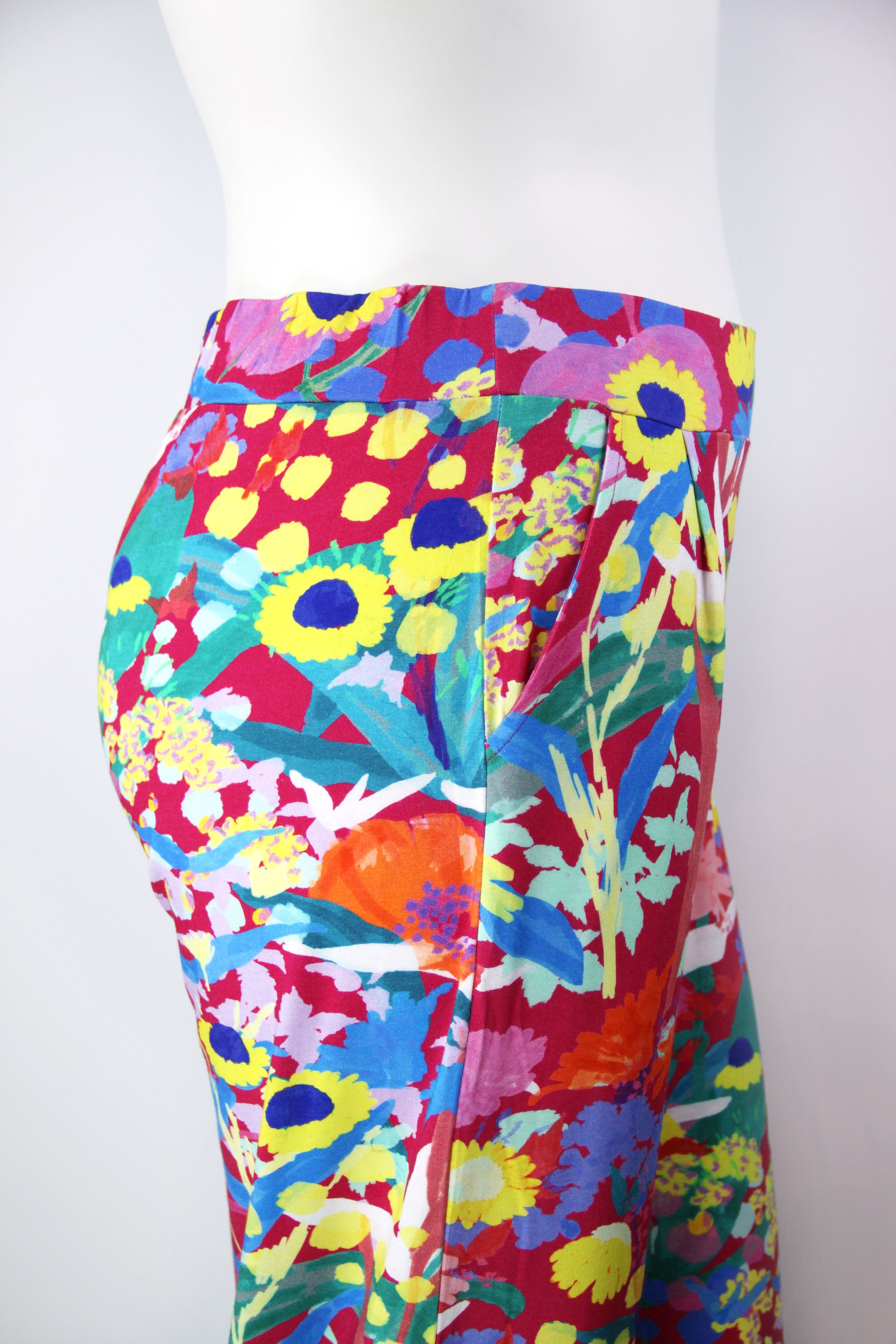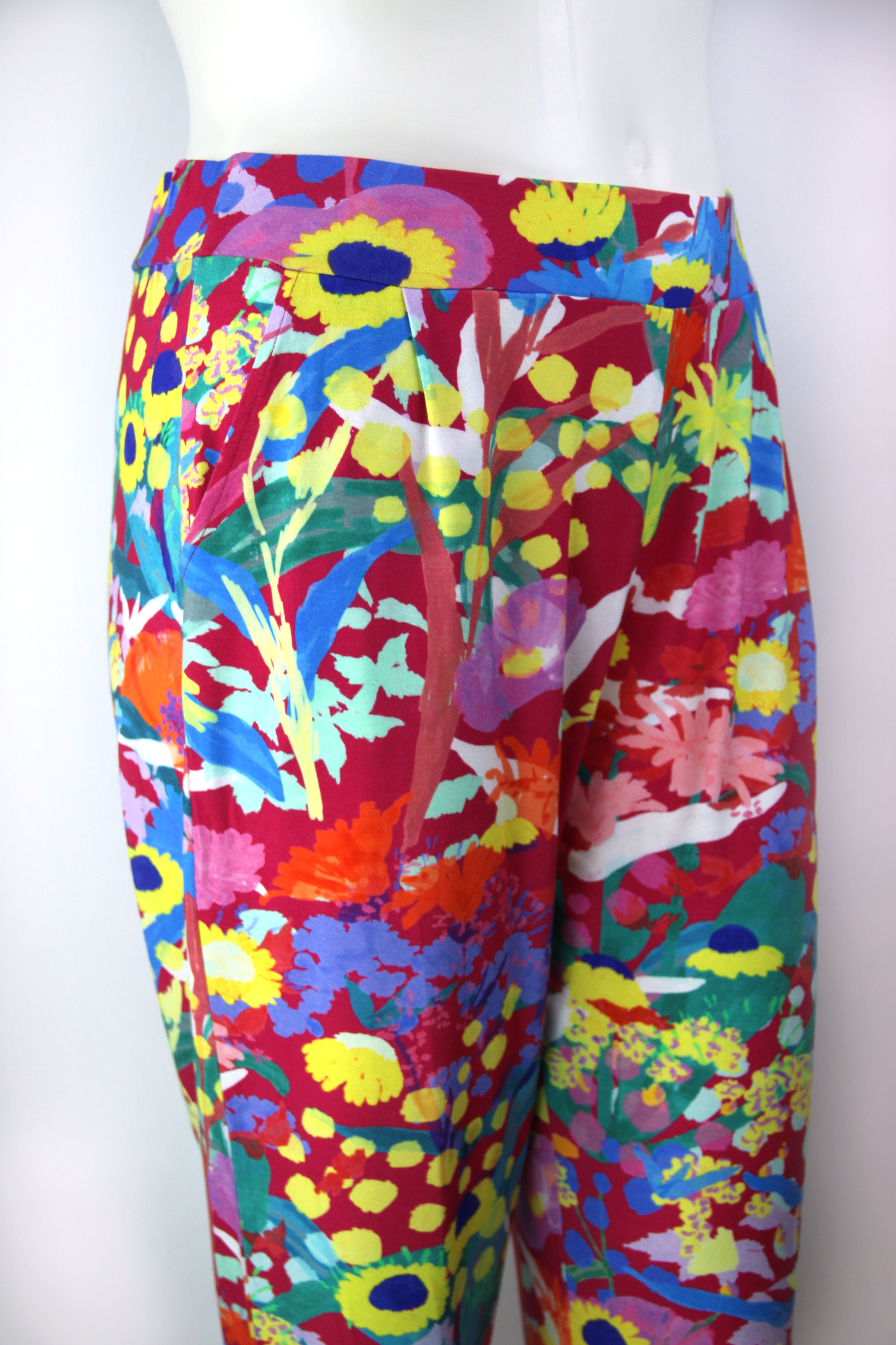 Letní kalhoty z jemné viskózy mají moderní květinový vzor. Nohy jsou mírně rozšířené a vzdušně vlají kolem nohou. Materiál:90% viskóza,10% elasthan