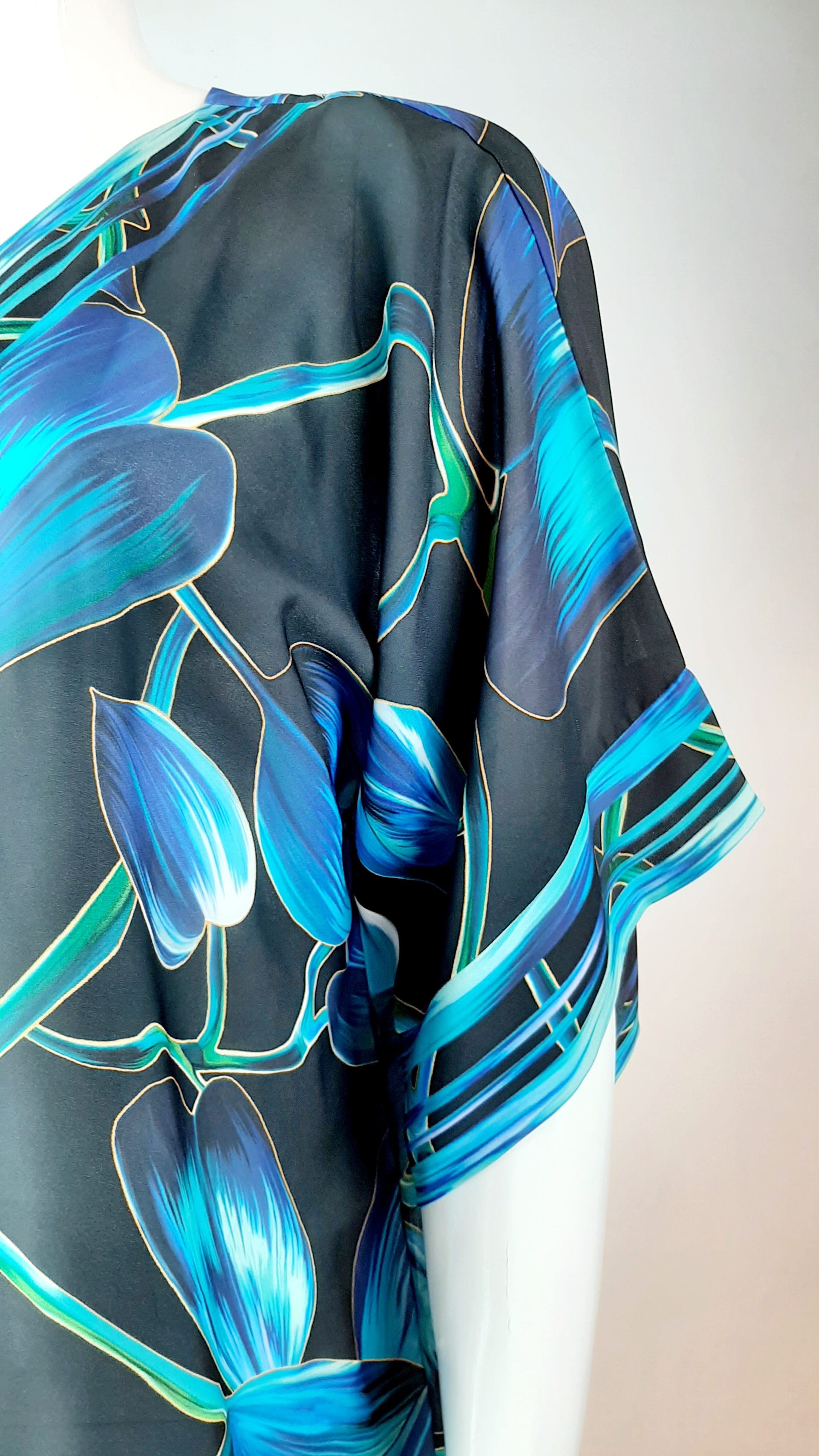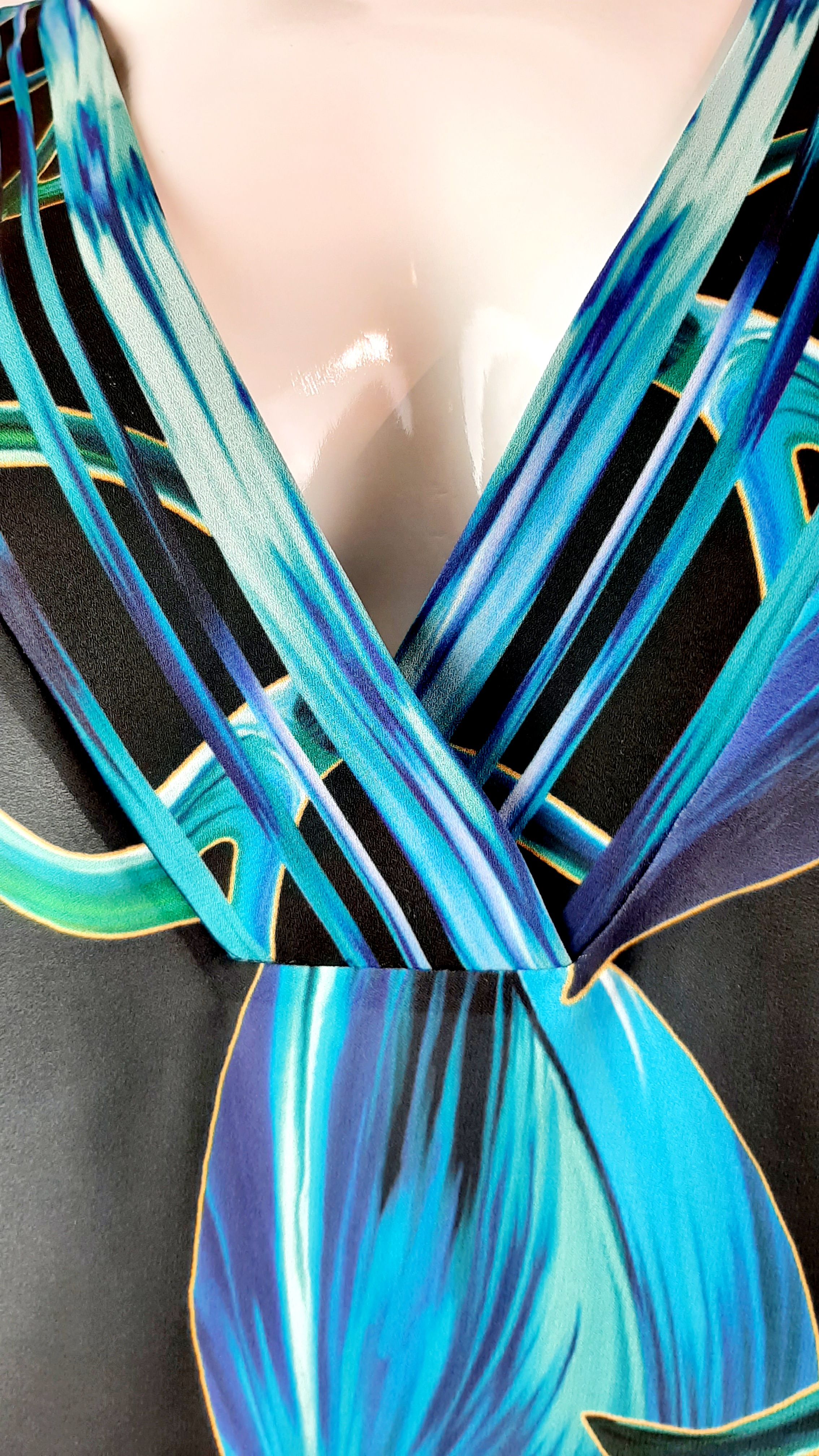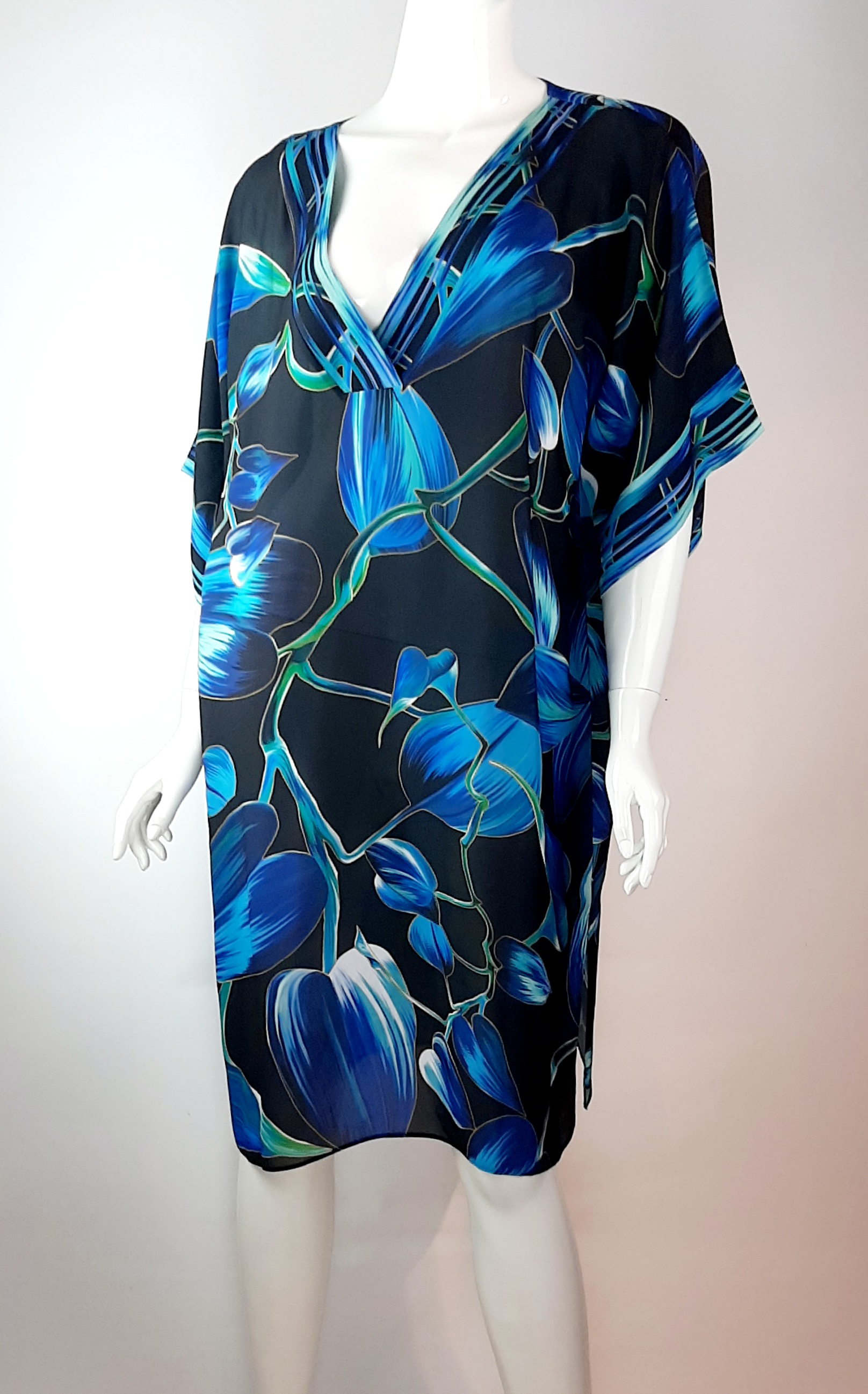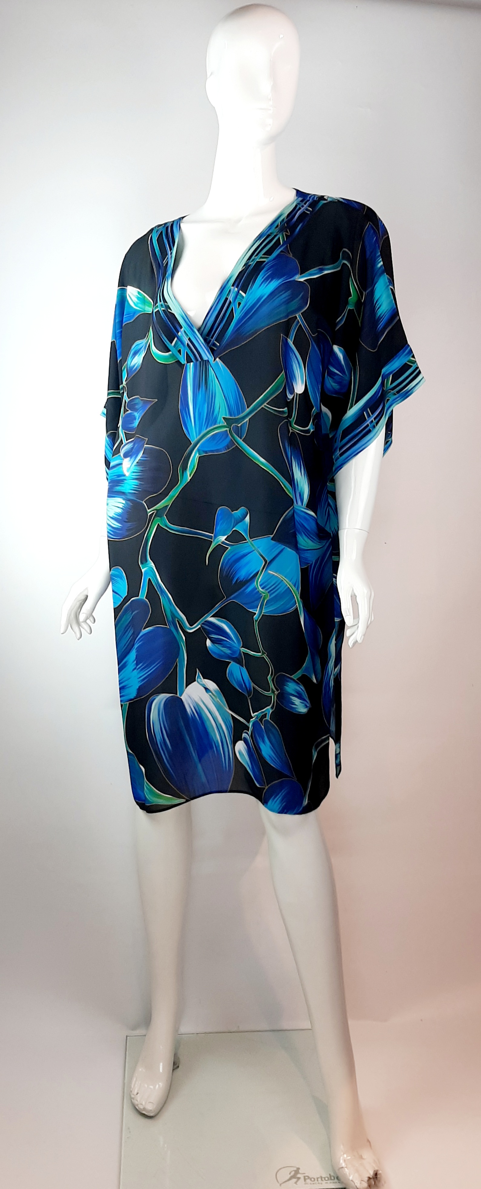 Plážové šaty v atraktivním stylu. Krásné barvy a lehký materiál krásné doplní plavky ve stejných odstínech nebo pomůže rozsvítit i například černé elegantní plavky. Volný střih s širokými rukávy a výstřihem do V v dekoltu zaručí snadné oblékání. 100% viskóza