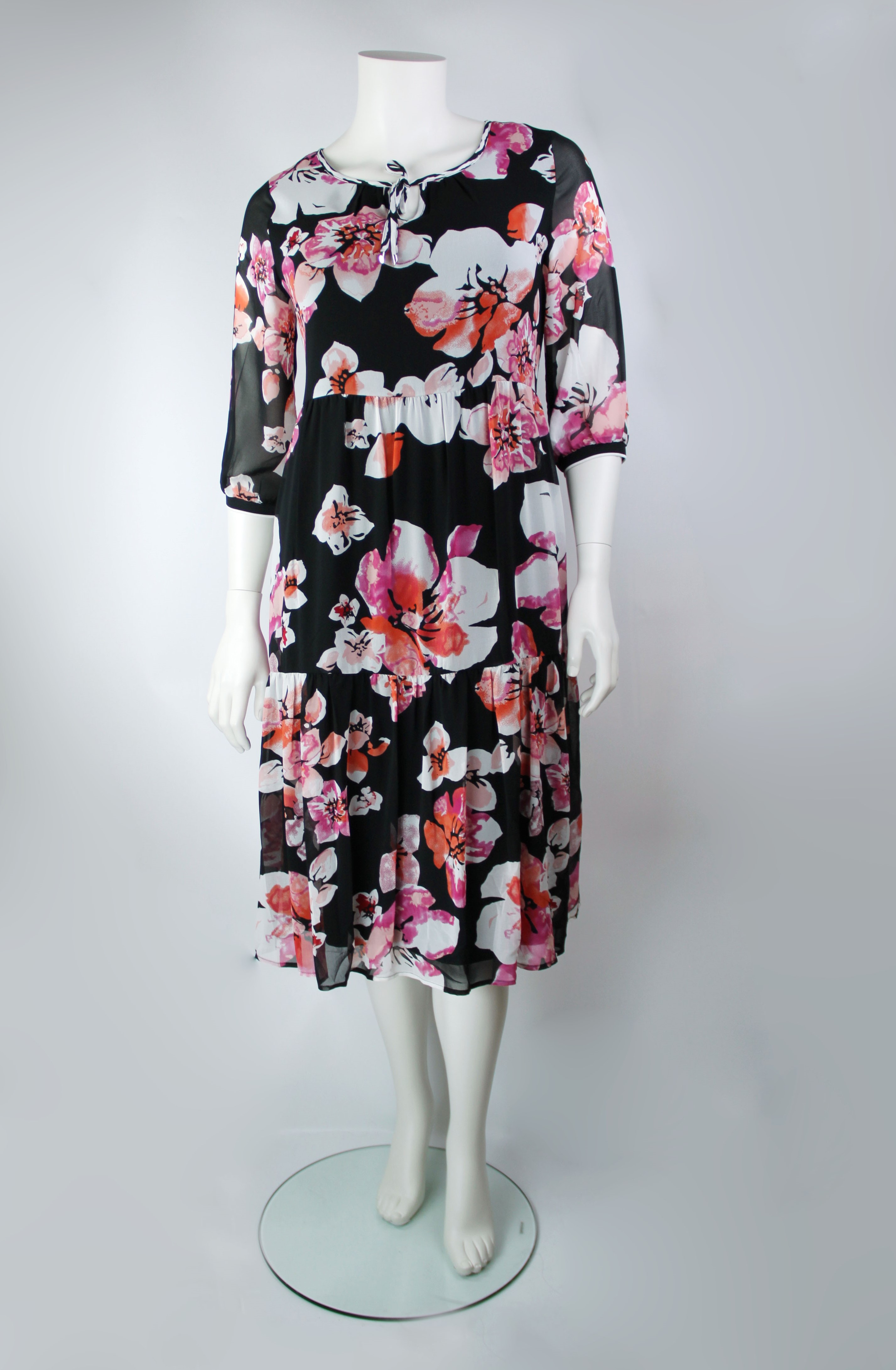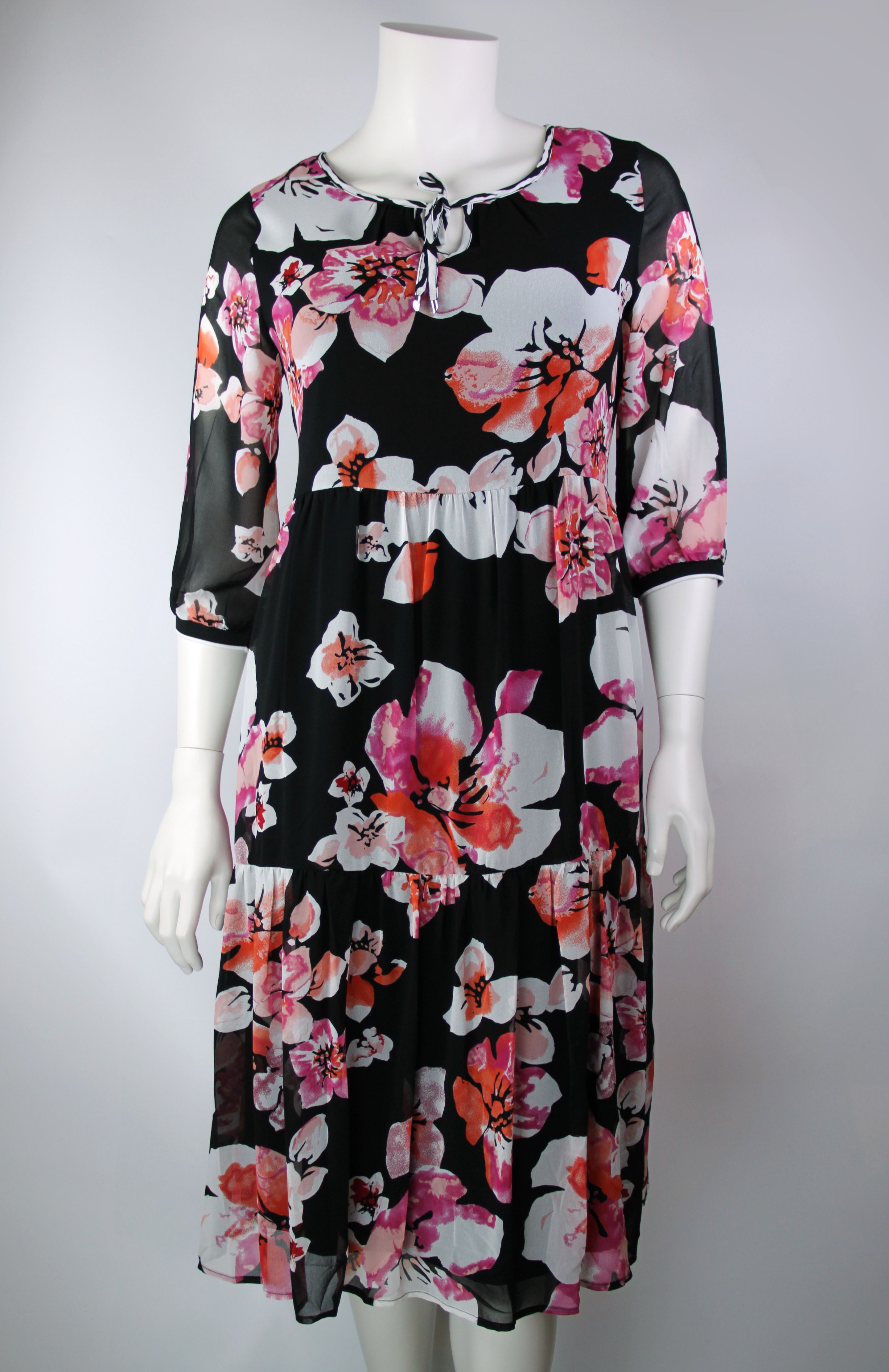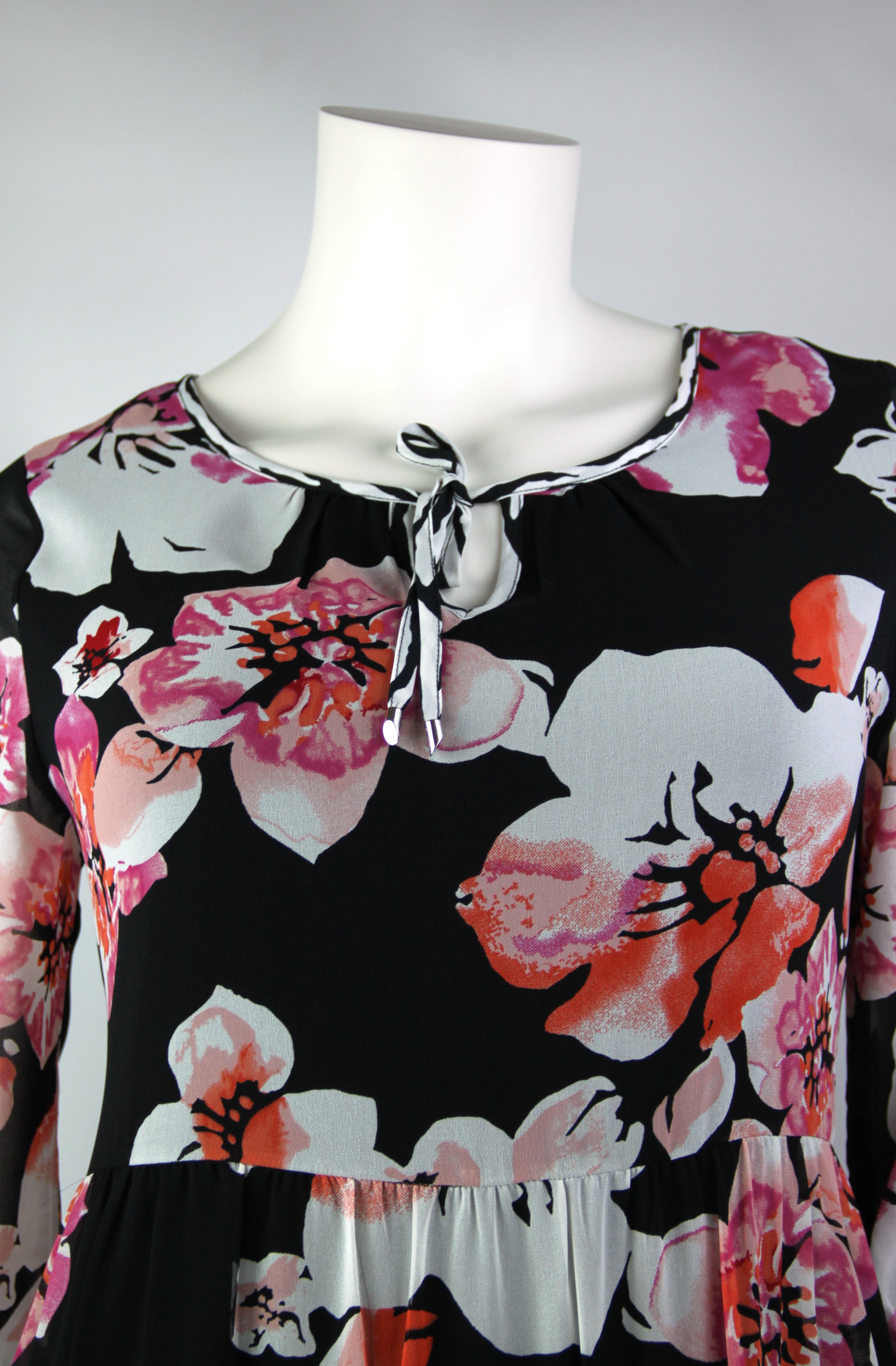 Tyto splývavé viskózové šaty s kontrastním květinovým celoplošným potiskem zaujmou svým volným střihem pro maximální pohodlí. Čistá,a splývavá viskóza z nich dělají ideálního společníka pro ženský a stylový vzhled. Materiál:100% viskóza