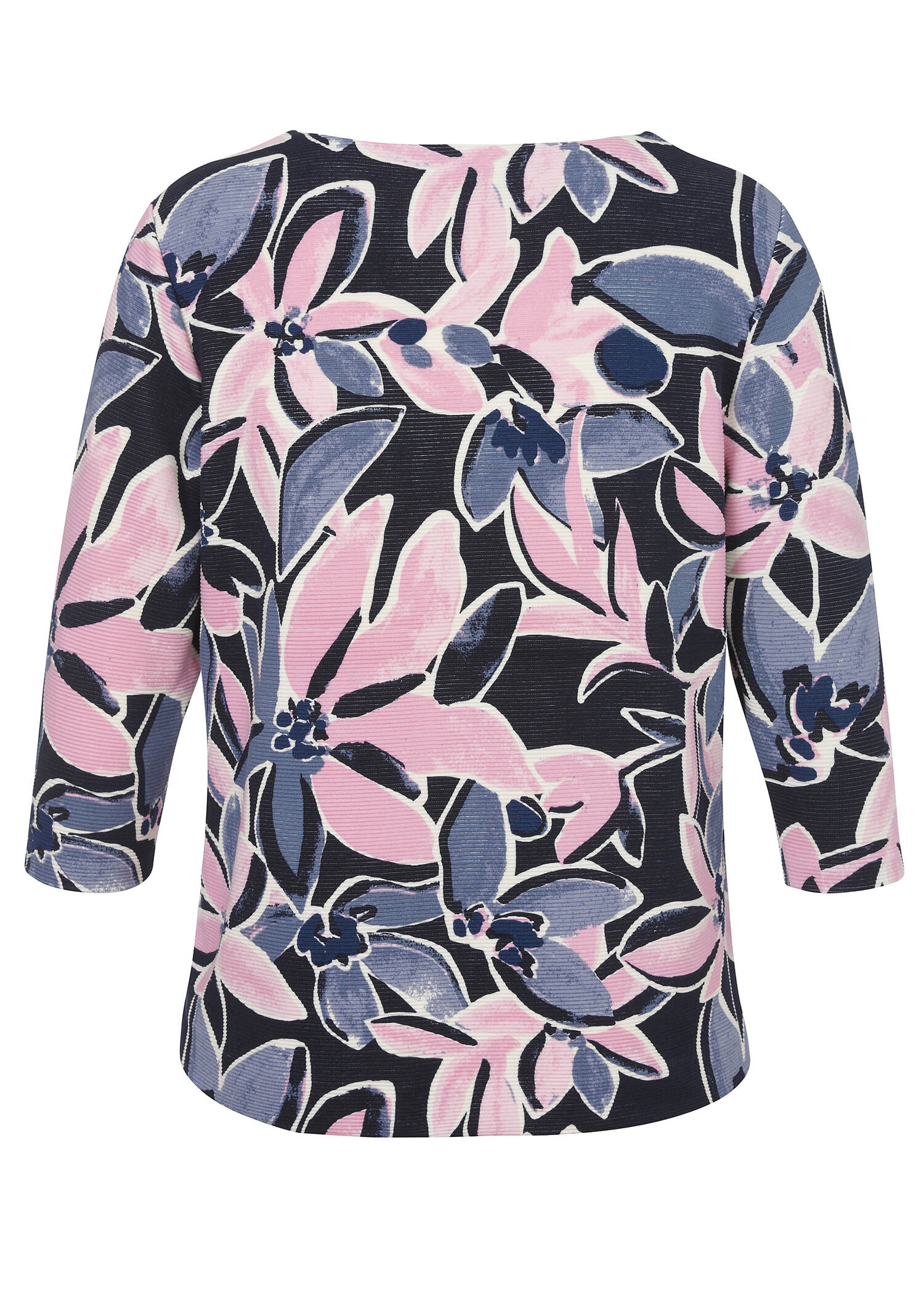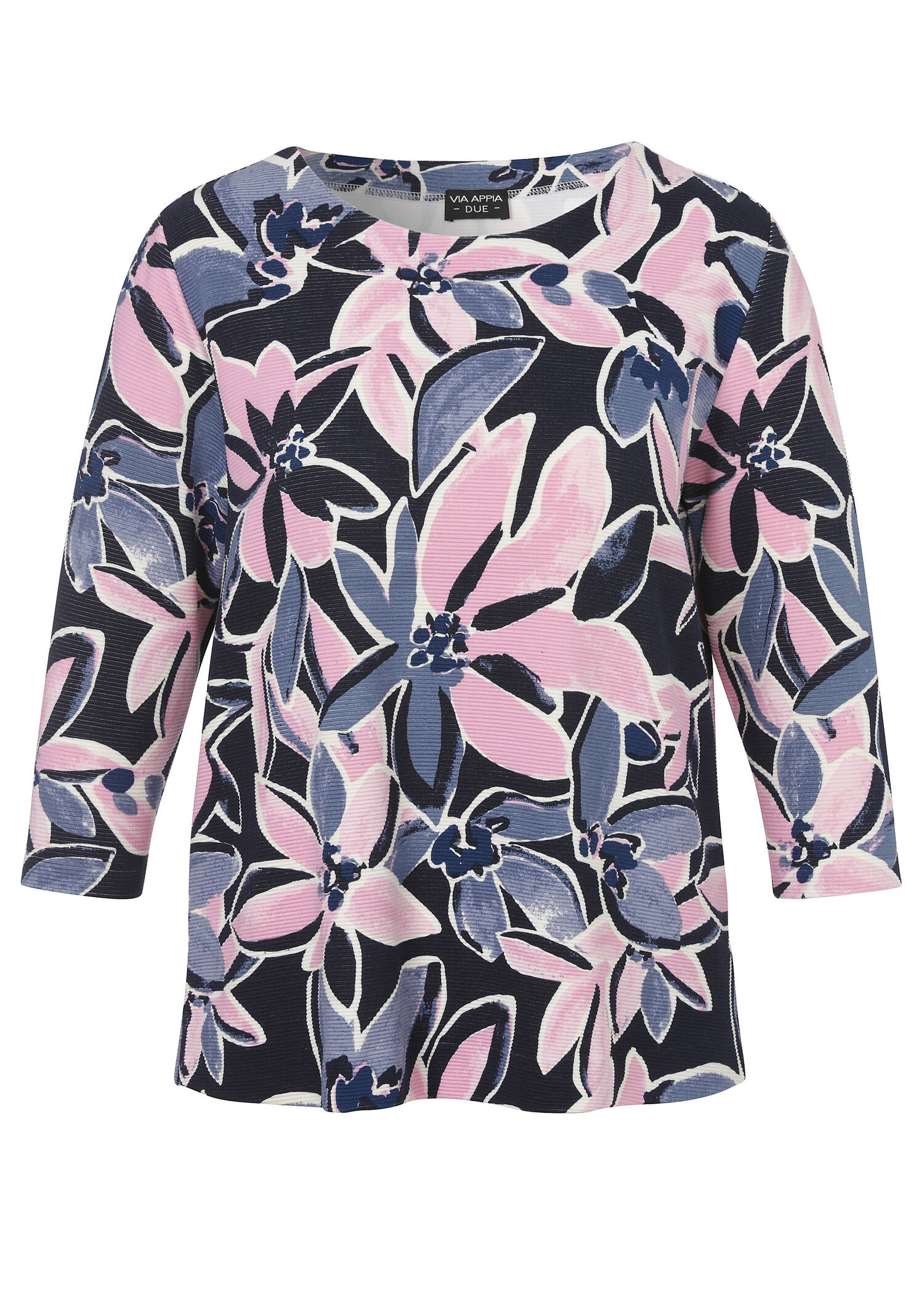 Dámská mikina od VIA APPIA DUE s 3/4 rukávem s květinovým celoplošným potiskem a lehkou žebrovanou strukturou ve volném střihu, který obepíná postavu. Materiál:76% viskóza,20%,4% elasthan